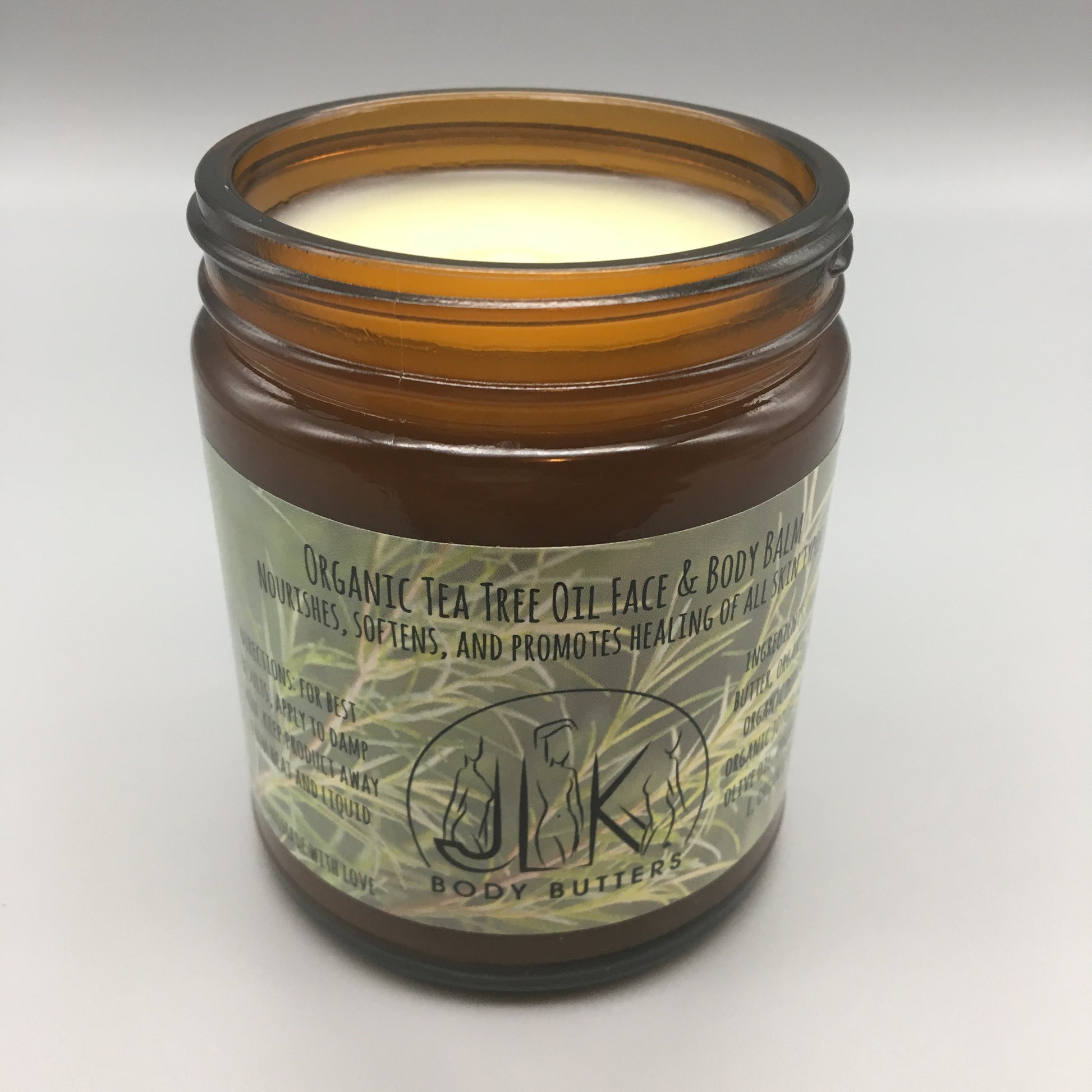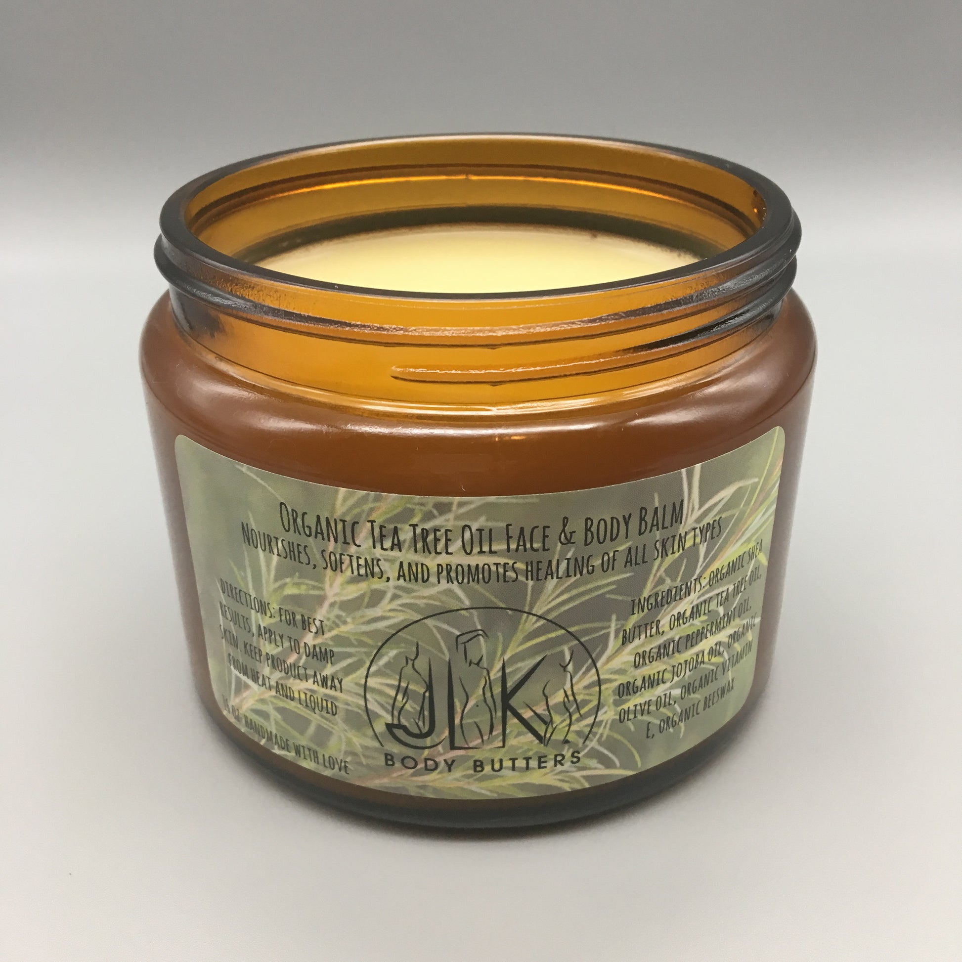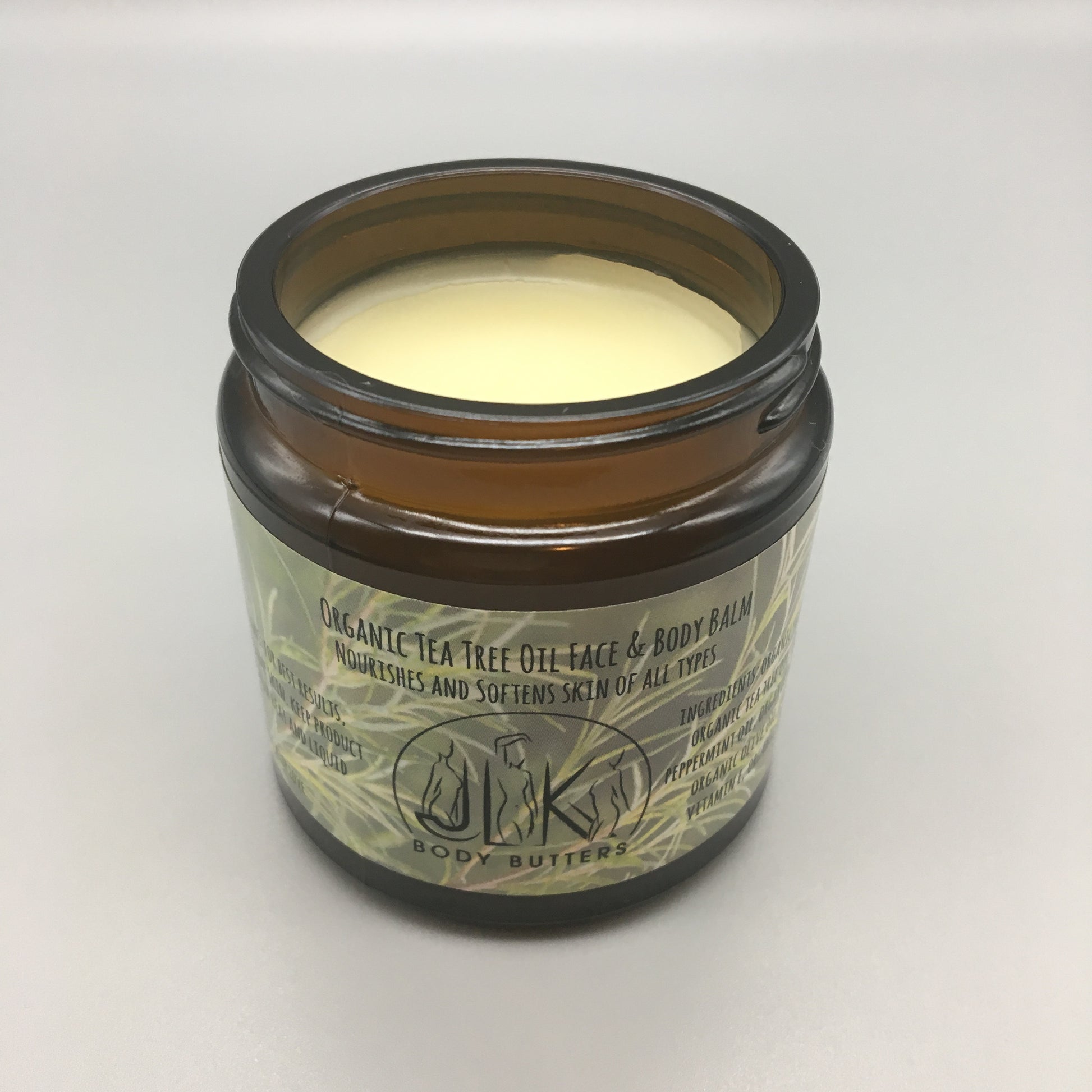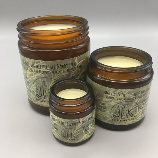 Our Organic Tea Tree Oil Face & Body Balm is a customer favorite! This balm is an effective combination of natural ingredients that contain anti-fungal and anti-microbial properties to relieve itching, irritation and sensitivity on the face and body. You will instantly feel the cool refreshing sensation of the tea tree oil upon applying while simultaneously experiencing the nourishing and rejuvenating qualities of Rosehip, Turmeric, Jojoba, Argan, Moringa, and Aloe Vera oils as it helps to provide quick relief of sore, itchy, cracked and inflamed skin. This balm has all the properties of our original body balm with the additional anti-fungal and anti-microbial properties of the essential oils; it truly will wipe the day away as it hydrates, softens and relieves all areas of the body. Note: Tea Tree Oil has a strong medicinal aroma.